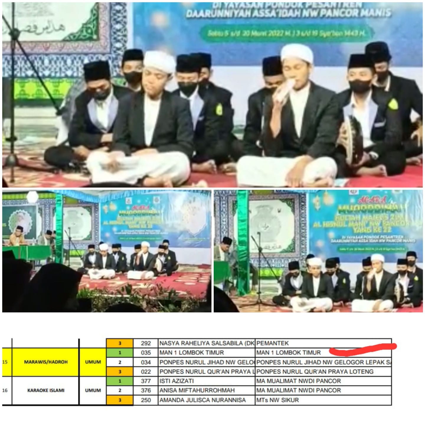 Capaian prestasi yang kedua berhasil diraih tim ektra marawis awal tahun ini setelah sukses merebut juara 1 lomba hadrah Se NTB di MAN IC Lotim pada awal tahun kemarin, ungkap Jien Tirtha Raharja selaku pembina marawis MAN 1 Lotim yang juga dikenal.sebagai vokalis the Band Datu Lombok. Ungap M Nurul Wathoni selaku kamad MAN 1 Lotim.
