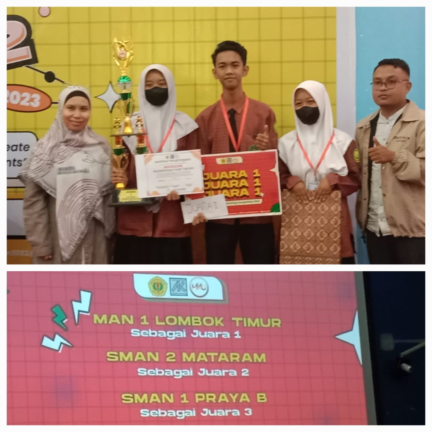 Prestasi akademik dan non akademik siswa MAN 1 Lotim memang sudah tidak diragukan lagi, hal ini dapat dibuktikan dengqan ragam prestasi yang mampu diraih dalam berbagai event kompetisi yang digelar berbagai pihak, salah satunya pada pertengahan bulan Mei 2023, Universitas Mataram menggelar lomba 2 bidang studi yakni Fakultas MIPA menyelenggarakan olimpiade matematika dimana 2 siswa MAN 1 Lotim berhasil meraih juara 1 dan 3. Selanjutnya pada Sabtu 13 Mei 2023 ini Fakultas Ekonomi menggelar olimpiade akuntansi Se NTB dan kembali tim siswa MAN 1 Lotim sukses merebut juara 1 yang diraih tiga siswa yakni Lalu Muhammad Naufal Ar-Rasyid XI MIIA 1, Siti Aliyatul Mubarokah XI MIIA 1 dan Meydina Maryam XI IIS 1. Pada kompetisi ini 2 tim MAN 1 Lotim berhasil melaju ke babak final, namun tim A belum beruntung bisa metaih prestssi juara dan akhirnya tim B yang sukses meraih juara 1, disusul tim SMAN 2 Mataram jyara 2 dan juara 3 diraih SMAN 1 Praya.