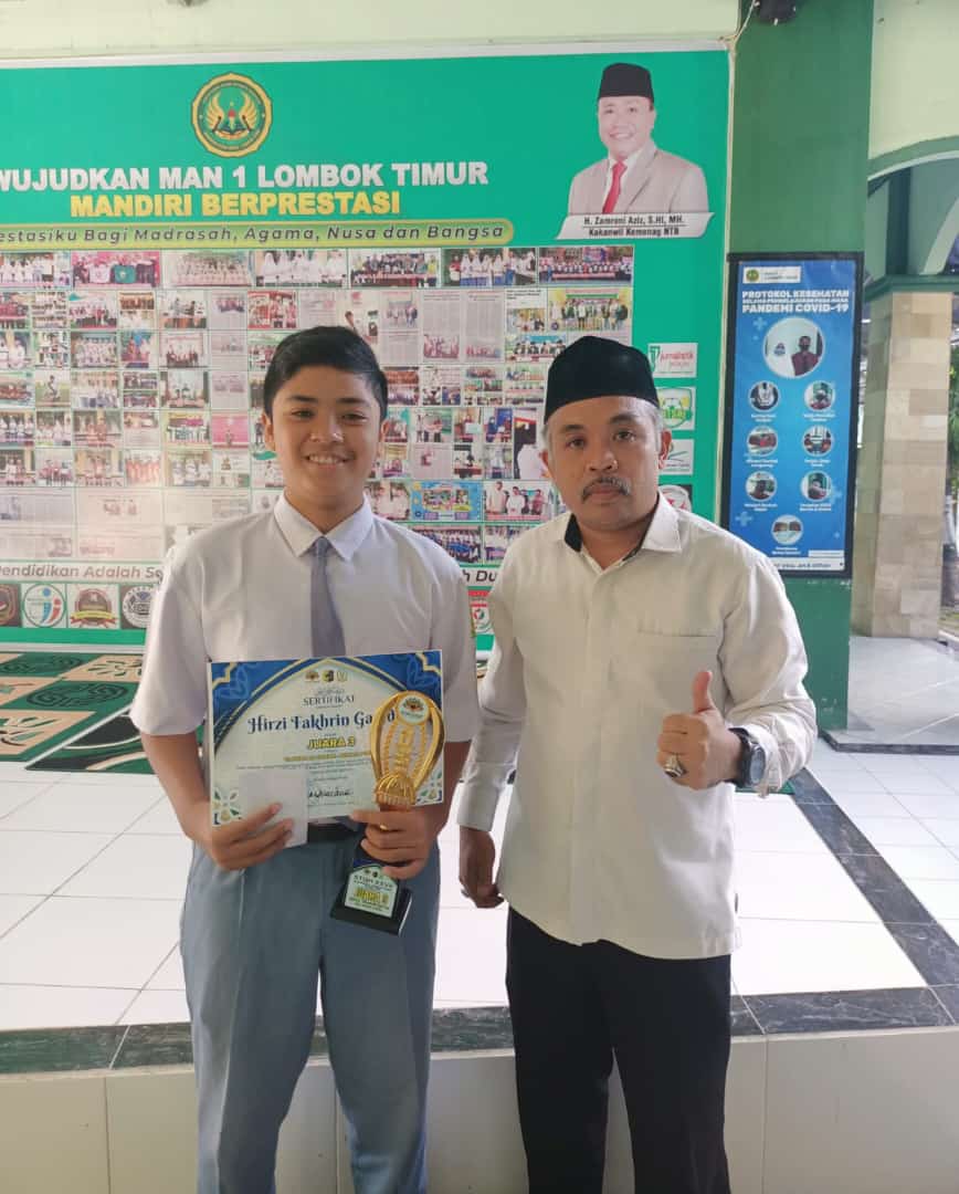 Kembali, MAN 1 Lotim dibikin bangga! Kali ini siswa atas nama Hirzi Fakhri Gamdan kelas XI Agama yang membawa kemenangan dengan meraih Juara 3 Kategori Putra STQ 2023.